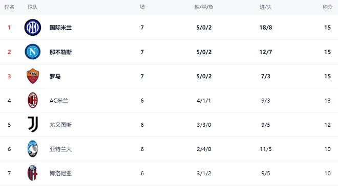 在积分榜上,前3的球队积分相同。国际米兰5胜2平拿到15分,升到了榜首位置。输球的那不勒斯也是15分,但净胜球只有5个,只能排名第2。罗马也是15分,但净胜球只有4个,排名第3。AC米兰13分排名第4。第5的是尤文图斯,3胜3平保持不败,拿到12分。亚特兰大也是不败战绩,2胜4平,拿到10分排名第6。博洛尼亚和萨索洛同样积10分,排名第7和第8。