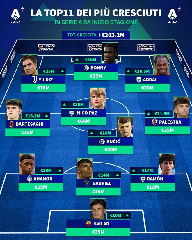 北京时间12月23日,在更新了意甲球员的身价之后,德转还列出了自2025-26赛季开始后,身价涨幅最高的11人阵容,尼科-帕斯暴涨3000万欧元第一,凯南-伊尔迪兹上涨2500万欧元第二,帕莱斯特拉上涨2150万欧元第三,巴尔泰萨吉、博尼以及苏契奇也都榜上有名。