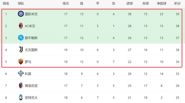 客场顺利拿到3分,尤文在意甲也连续5轮不败,这支老牌豪门的状态明显回升。跟尤文一样,罗马也在客场战胜了莱切,拿到了3分。这一夜,意甲2大强队齐齐发力,他们不断追近榜首3强。截至目前,尤文和罗马都拿到36分,只落后榜首的国米3分,对于这2大强队来讲,意甲争冠并非遥不可及的事。