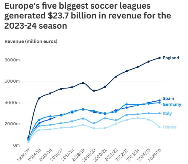 德勤的分析显示,1996-97赛季英超联赛成立时,欧洲五大联赛的总收入还仅为25亿欧元。