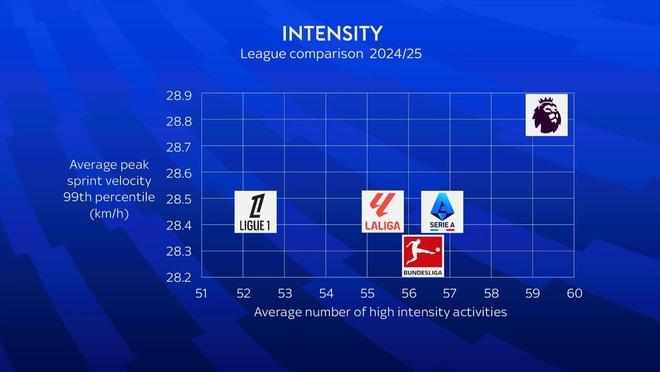 数据显示,英超场均高强度跑动次数接近60次,明显高于意甲、西甲、德甲和法甲。在平均最高冲刺速度方面(取球员速度分布里最快的1%的平均值),英超同样处于领先区间,平均达到28.8公里/小时,是五大联赛中最快的。