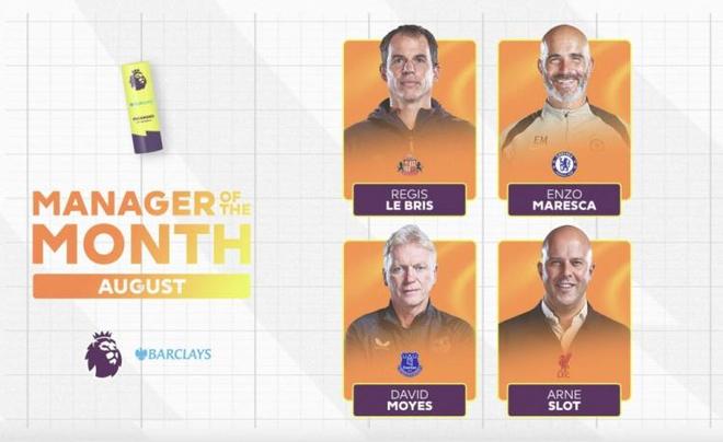 直播吧9月4日宣 英超官方公布8月最佳教练候选。桑德兰主帅布里斯、切尔西主帅马雷斯卡、埃弗顿主帅莫耶斯以及利物浦主帅斯洛特入围。