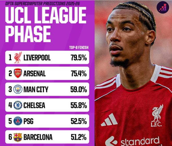 超级计算机模拟显示,利物浦有23.9%概率联赛阶段头名,79.5%概率进入前八名直接晋级。