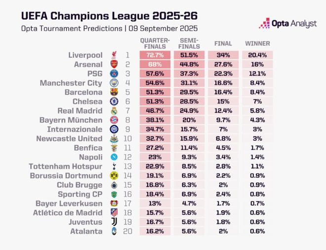 Opta超级计算机通过10,000次模拟得出赛前概率: