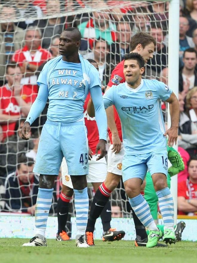 曼城做客老特拉福德面对曼联,巴神“天神下凡”,在进球后巴洛特利掀起球衣展示出经典的:“Why always me”