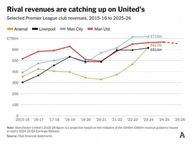 然而,25/26赛季预计将是曼联收入连续第四年在6.4亿至6.7亿英镑的区间徘徊,而竞争对手仍在增长,债务不降反升,老特拉福德的复兴之路依然任重道远。