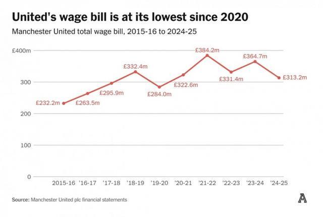 自拉特克利夫从格雷泽家族手中接管足球运营以来,为扭转财务局面,他已推行一系列成本削减措施。一项涉及多达450个岗位的裁员重组计划,加之无缘欧冠导致的奖金缺失,共同使曼联的工资支出降至3.132亿英镑,为19/20赛季以来的最低水平。