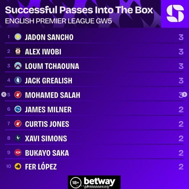 直播吧9月24日宣 英超第5轮战罢,squawkafootball列各项数据排行,桑乔等5名球员3次成功将球传入禁区,为本轮联赛最多。