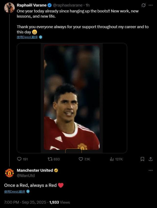 直播吧9月25日宣 瓦拉内在自己退役一周年之际更新社媒,他写道: