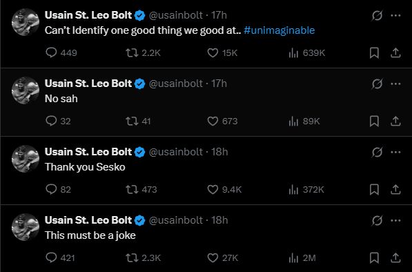 但是仅仅一小时之后,博尔特就在社媒写道:“我只能不断摇头……”
