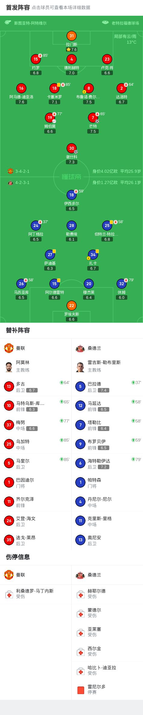 第31分钟,达洛特手抛球造混乱,谢什科门前包抄破门,曼联2-0桑德兰!