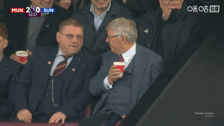 第52分钟,两球领先,弗格森爵士在看台和朋友交谈甚欢