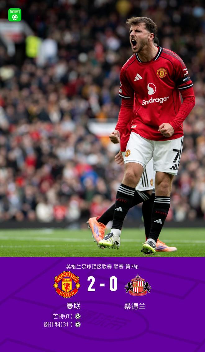 北京时间10月4日晚间22:00,英超联赛第7轮,曼联坐镇主场老特拉福德球场,迎战桑德兰,本场比赛主裁判为斯图亚特-阿特维尔,上半场,姆伯莫助攻芒特首开记录,B费兜射中柱,迪亚洛错失良机,谢什科扩大比分。下半场,拉门斯出击与伯特兰-特拉奥雷相撞引发争议,布罗贝伊造险,塔勒比错失单刀。最终,曼联2-0桑德兰。