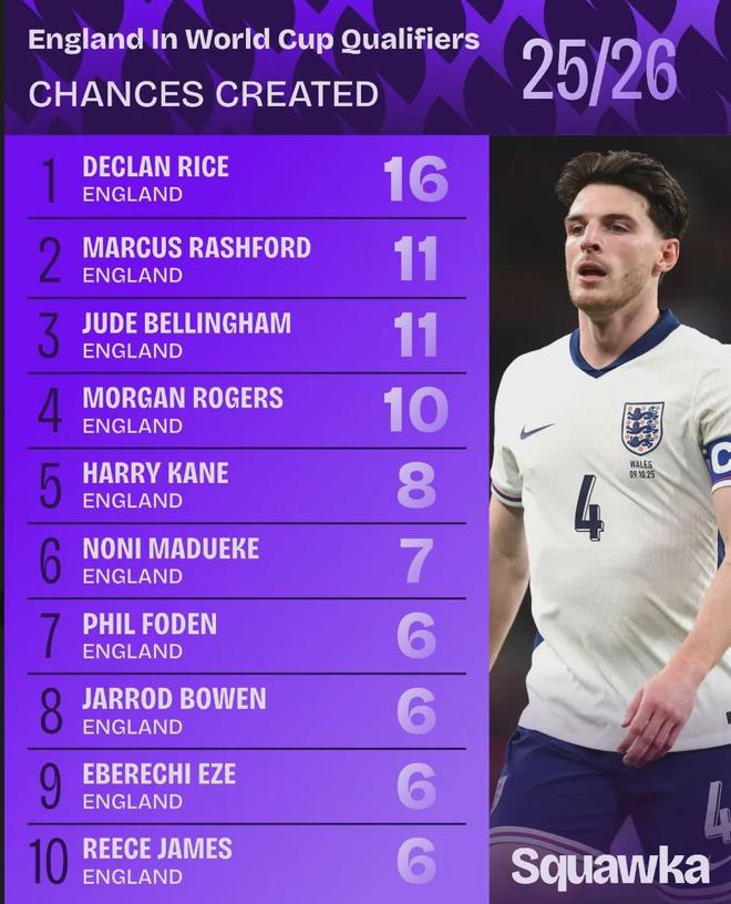 Squawka统计,赖斯是英格兰在世预赛期间创造机会最多的球员:16次。