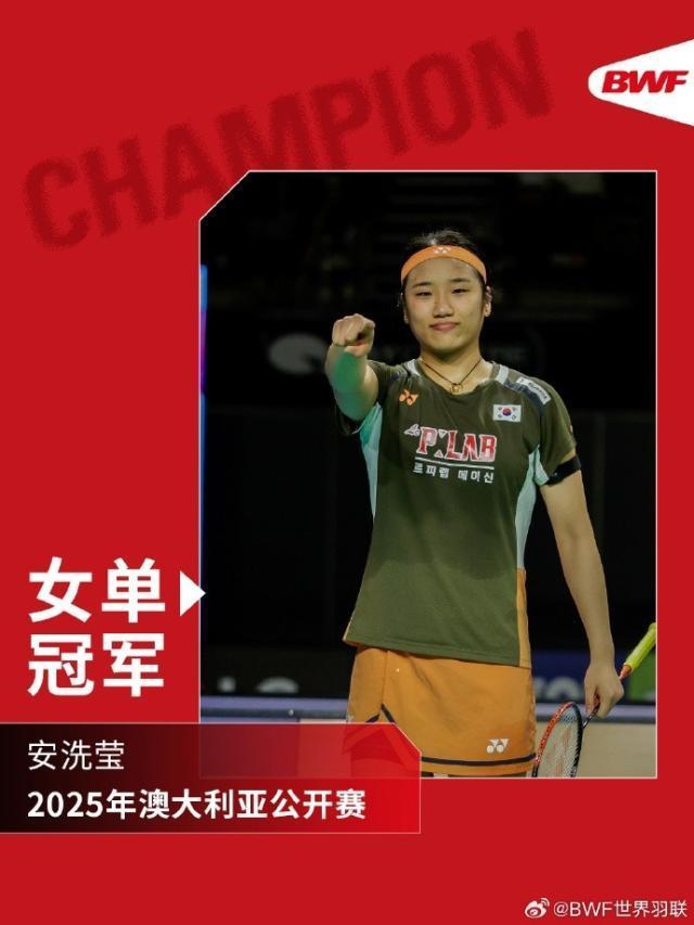 澳大利亚羽毛球公开赛决赛,韩国选手安洗莹21比16、21比14印尼选手瓦尔达尼,夺得冠军。同时,这也是安洗莹获得的赛季第十冠。