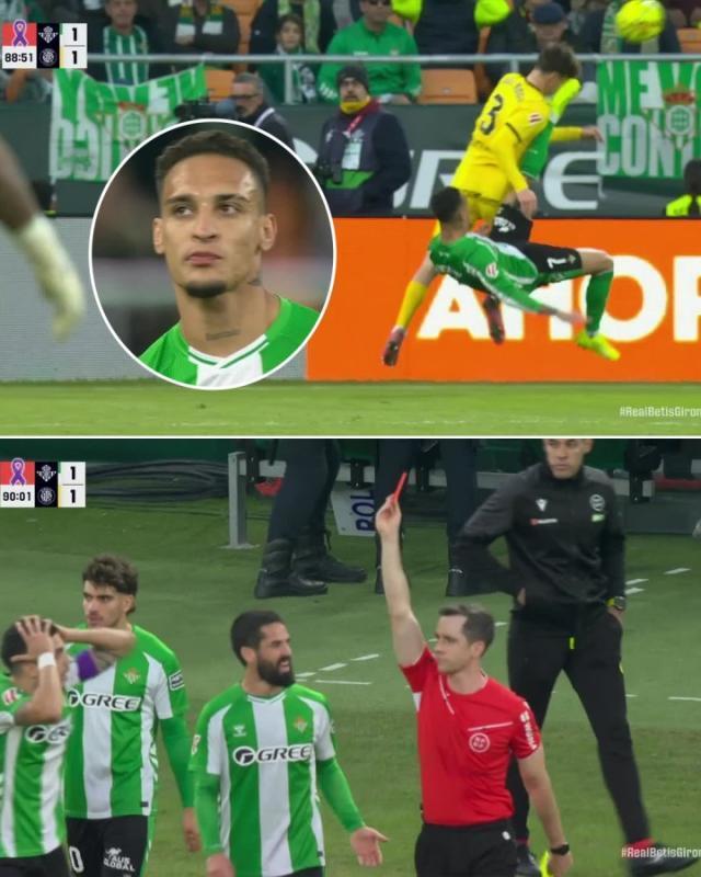贝蒂斯本轮1比1战平赫罗纳,第90分钟,安东尼一个倒勾动作踢到对手头部,裁判看VAR后将他直红罚下。