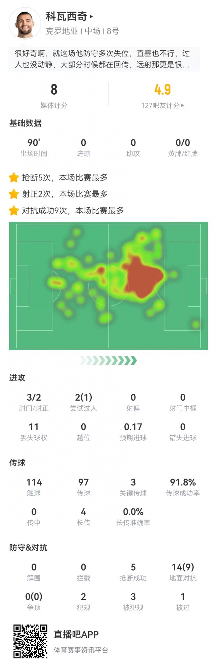 6月19日报道 克罗地亚在本轮欧洲杯2-2战平阿尔巴尼亚,科瓦西奇本场数据如下: