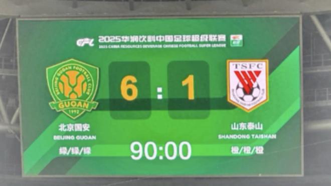 今天的中超联赛,山东泰山6:0战胜北京国安。