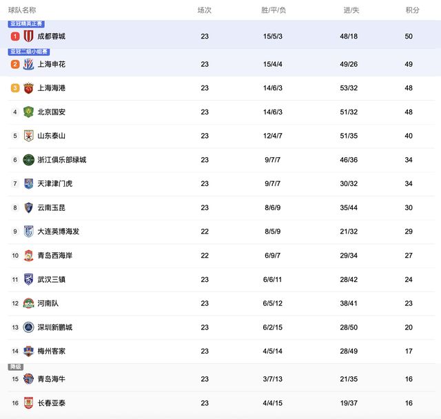 排名第一的成都蓉城,战绩为15胜5平3负积50分进48球失18球。