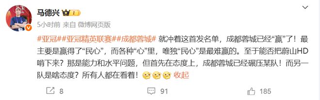 蓉城队尽管是首次参加亚冠正赛,但是主教练徐正源对待比赛的态度,却得到了国足跟队记者马德兴的表扬。马德兴表示:就冲着这首发名单,成都蓉城已经“赢”了!而另一队是啥态度?所有人都在看着!