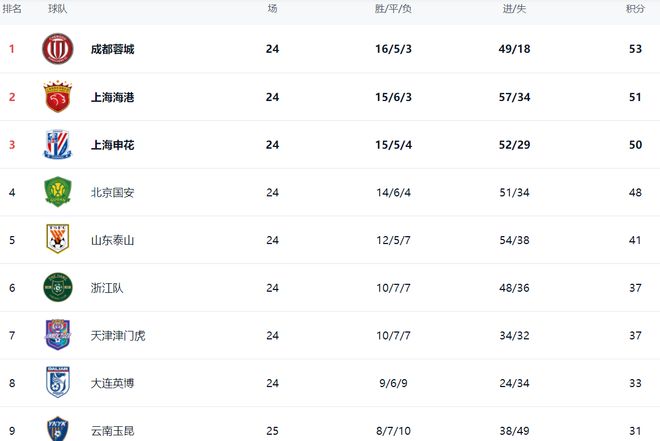 在积分榜上,成都蓉城以53分排名榜首。第2名的是上海海港,拿到了51分。上海申花以50分紧随其后。至于北京国安,就有点掉队了,只拿到48分,排名第4。山东泰山41分排名第5。浙江队和天津津门虎都是37分。大连英博33分,排名第8。云南玉昆31分,排名第9。