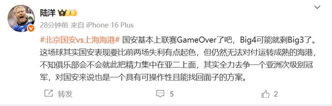 媒体人陆洋在个人社交上表示:国安基本上联赛GameOver了吧,Big4可能就剩Big3了。这场球其实国安表现要比前两场失利有点起色,但仍然无法对付运转成熟的海港队,不知俱乐部会不会就此把精力集中在亚二上面,其实全力去争一个亚洲次级别冠军,对国安队来说也是一个具有可操作性且能找回面子的方案。