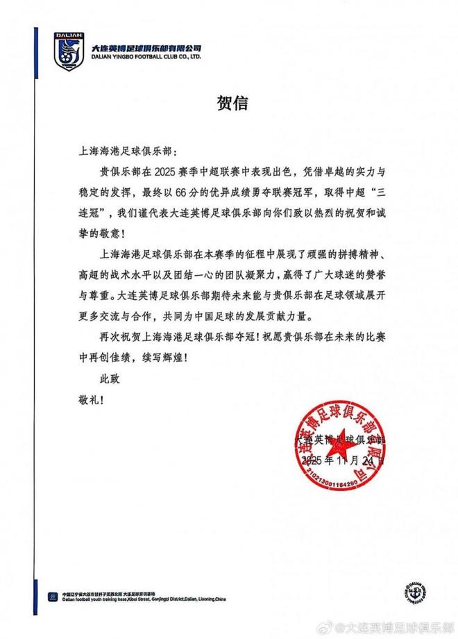 在贺电中,大连英博向海港的“三连冠”表达了祝贺和敬意。第二段,贺电表扬了海港顽强拼搏的精神和高超的战术水平,认为此举“赢得了广大球迷的赞誉和尊重”。话锋一转,贺电中大连英博表示希望未来能跟海港在足球领域展开更多的交流与合作。